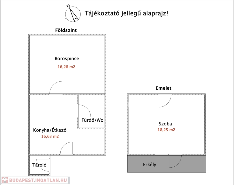 emelet, külön bejárattal, kívülről megközelíthető, ott 1 szoba (18,25 m2) valamint egy erkély található
