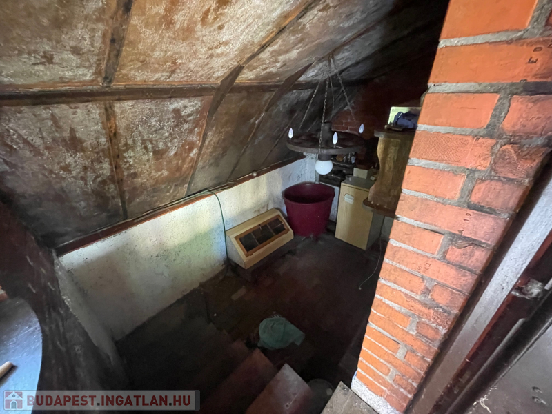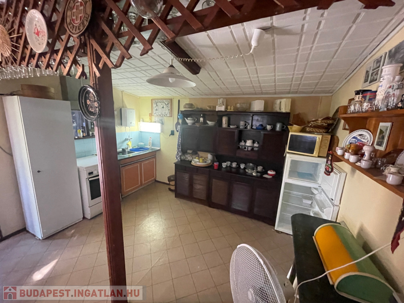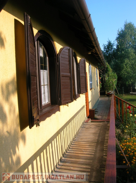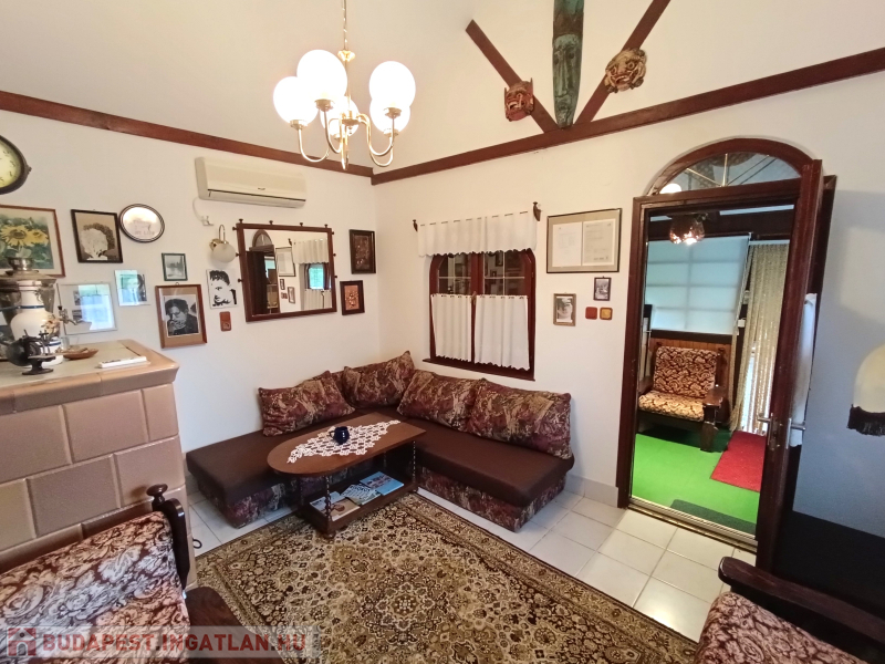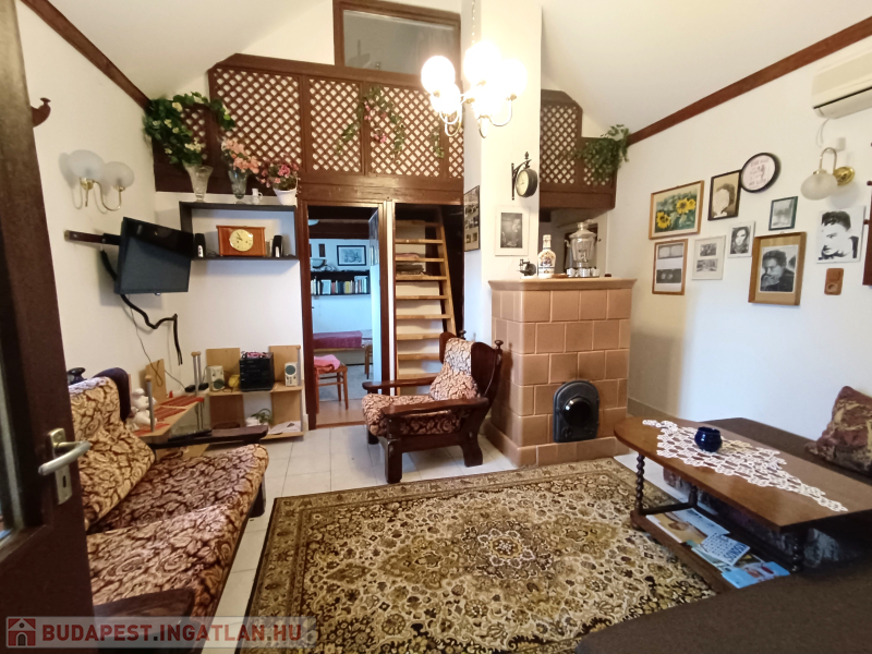 Jobb oldali, téglaépítésű lakrész: nappali, galériázott háló, zuhanyzós fürdőszoba + WC, tágas előtér, hálószoba. Fűtése: klíma és cserépkályha