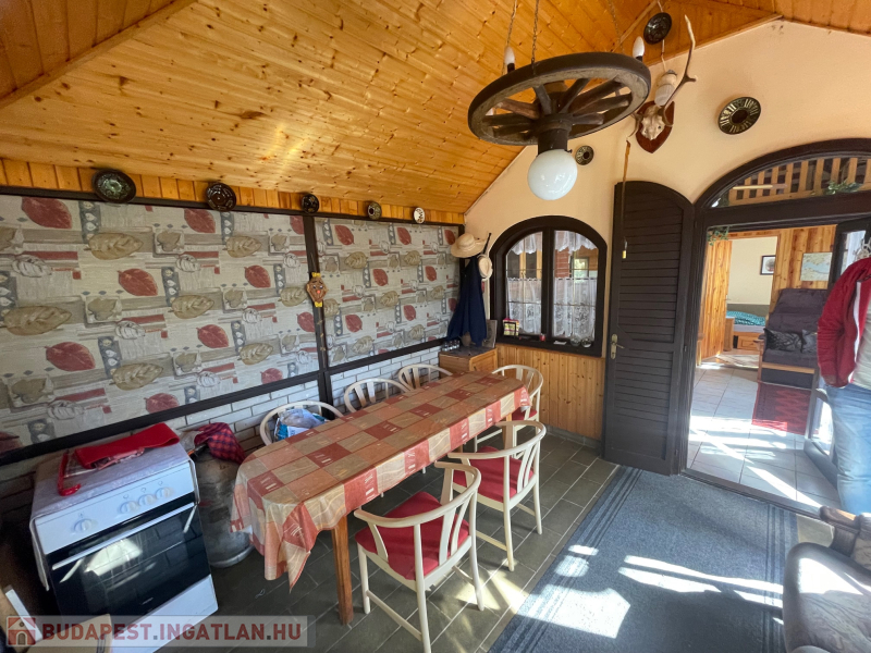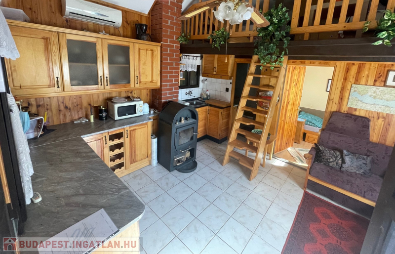 Bal oldali, könnyűszerkezetes lakrész: nappali, amely felett galériázott háló lett kialakítva, zuhanyzós fürdőszoba + WC, konyha, hálószoba, tágas előtér. Fűtése: klíma és lemezkandalló