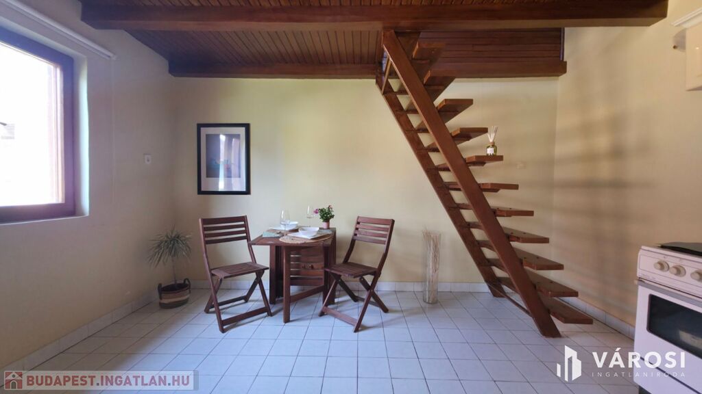 Az alsó szinten konyha és étkező került kialakításra, külön helyiségben a zuhanyzó és wc (teraszon keresztül megközelíthető), a felső szinten egy nagy szoba került kialakításra, mely egy fa lépcső segítségével megközelíthető.