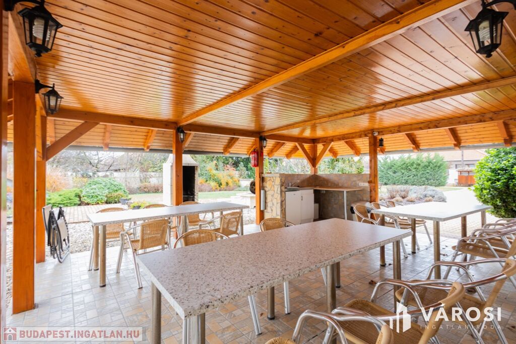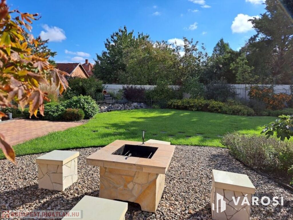 A tágas kertben a fedett terasz és gyermekjátszó mellett egy filagória is megtalálható, melyben szalonnasütő és grillező is ki lett alakítva. A duplatelken egy kertitó és számos dísznövény is helyet kapott, ez utóbbi öntözése fúrott kútról működtetett öntözőrendszerrel megoldott. Emellett 8 autó számára alkalmas beálló is kialakításra került. A telek méretéből adódóan igénytől függően további beépítésre is lehetőség van.