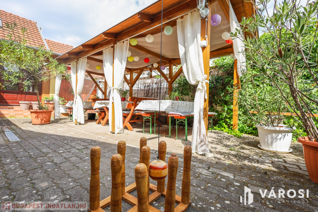 A kertben egy további tároló mellett egy tágas filagória, bográcsozó és egy szárazkapu beálló is helyet kapott.