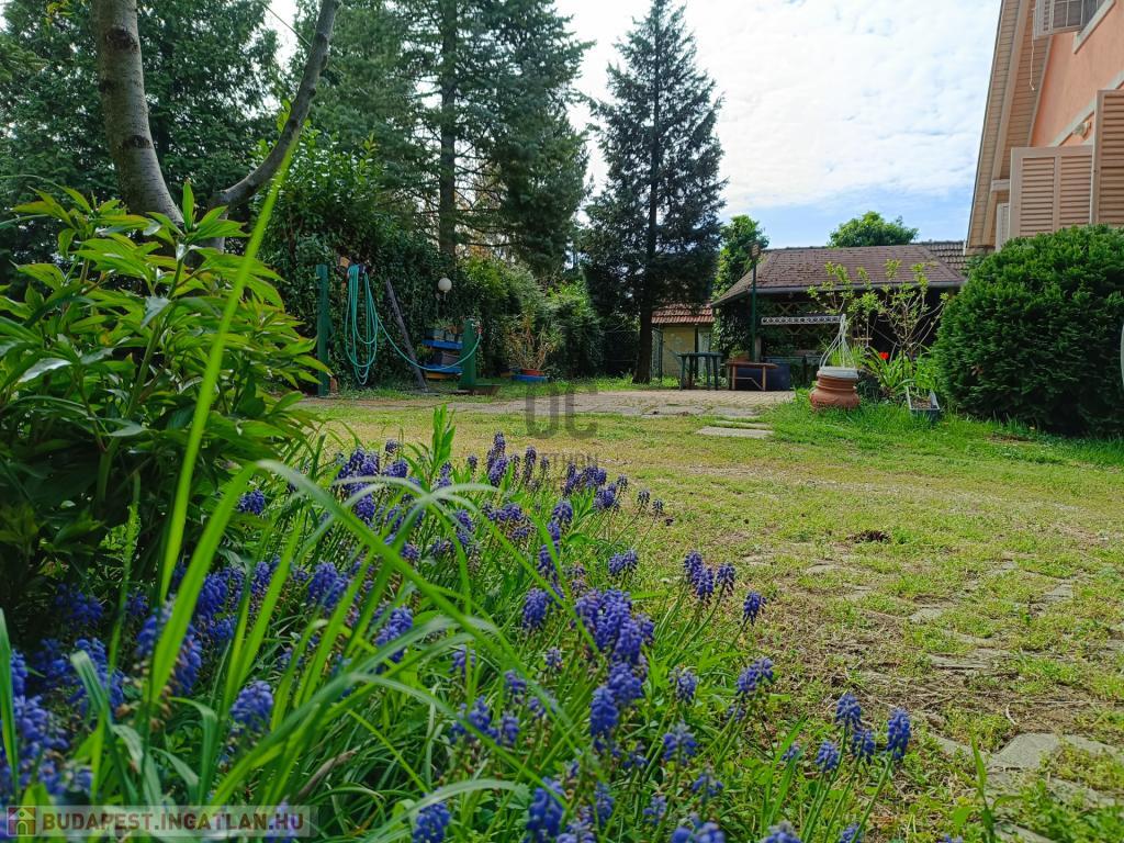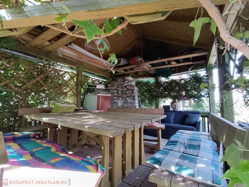 Az udvaron pergola és fedett épített kemence kapott helyet a sütögetéshez, bográcsozáshoz. Családi, baráti összejövetelek tökéletes helyszíne a zöld parkosított udvar, évelős cserjékkel, rengeteg nyíló virággal.