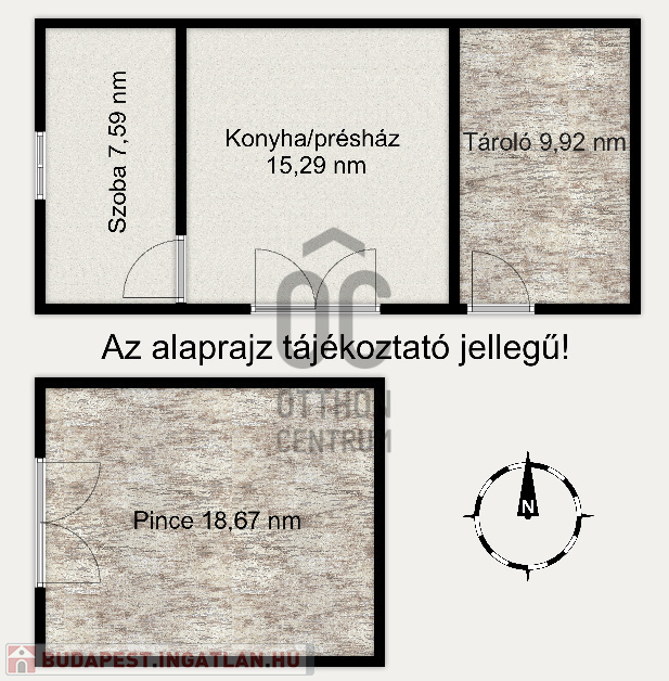 Az épület két szintes, alul egy 18,67 nm-es borospince, fent pedig egy 7,59 nm-es szoba, 15,29 nm-es konyha/présház, illetve külön bejárattal egy 9,92 nm-es tároló helyiség található.