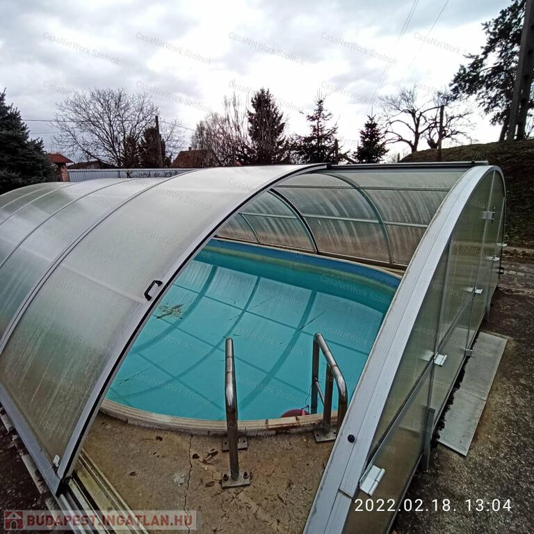 Az udvaron található a 21 m3 - es medence, amely fűthető automata vízforgatóval, polikarbonát fedéllel rendelkezik.