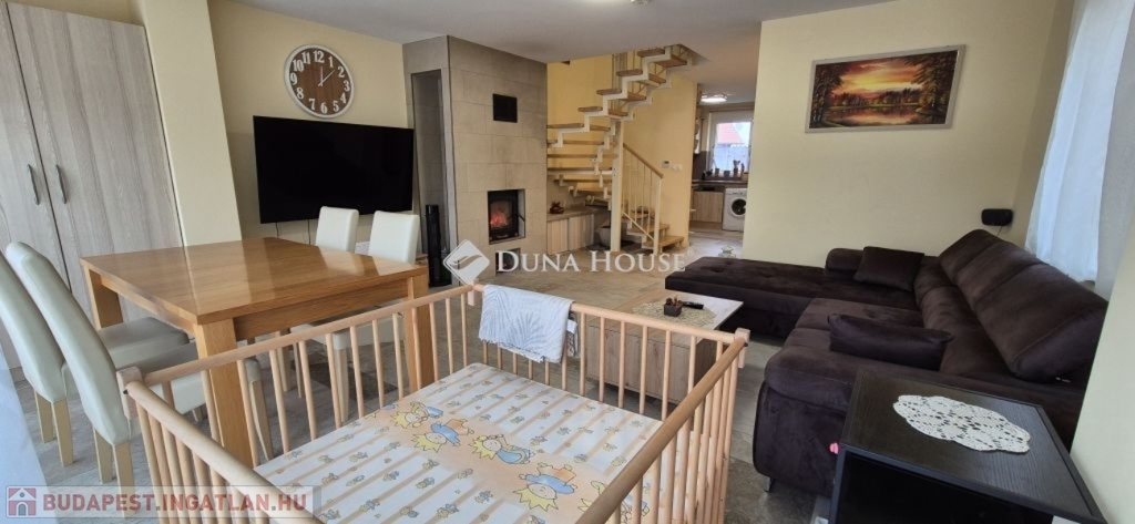 A nagyobbik, 100 nm-es ház alsó szintjén egy napfényes amerikai konyhás nappali, előszoba, fürdőszoba és egy wc kapott helyet. Az emeleten egy fürdő, wc, gardrob, tároló, és jelenleg 2 halószoba van, de a nagyobb háló opcionálisan megosztható. Úgy lett tervezve, ajtók, kapcsolok tekintetében, hogy csak egy válaszfalat kell felépíteni és máris 3 élhető méretű hálószoba áll az itt lakók rendelkezésére. Az ingatlanban a melegről a gazdaságos puffertartállyal ellátott kondenzációs gázkazán mellett egy hangulatos kandalló is gondoskodik, ami az otthon melegét és a természetesség érzetét hivatott fokozni. Padlófűtés található az alsó és felső szinten egyaránt, ami külön-külön is szabályozható. A nyári melegben egy modern hűtő-fűtő klíma gondoskodik az itt lakók komfort érzetéről. A tágas, gépesített konyhabútorral felszerelt konyha minden igényt kielégít, legyen szó egy gyors reggeliről vagy egy nagyobb családi vacsoráról. A tágas otthonunk békés kertre néző hatalmas Schüco hőszigetelt ablakokkal és hőszigetelt redőnnyel büszkélkedhet, melyek garantálják a nyugodt és természetközeli életet.