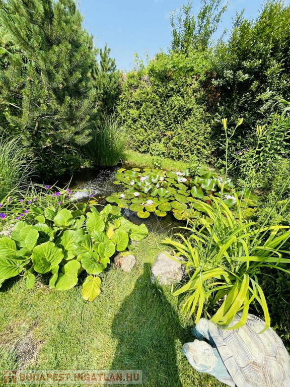 A kert gyönyörűen gondozott, örökzöld növényekkel, bokrokkal ültetett.