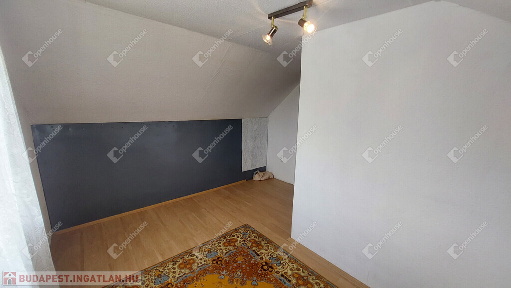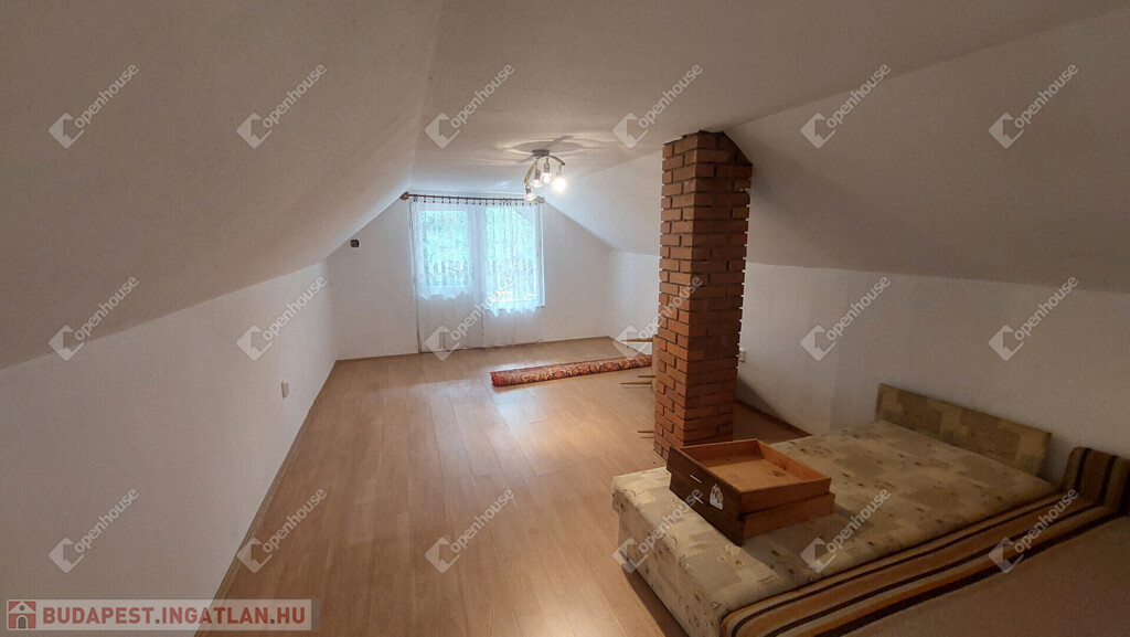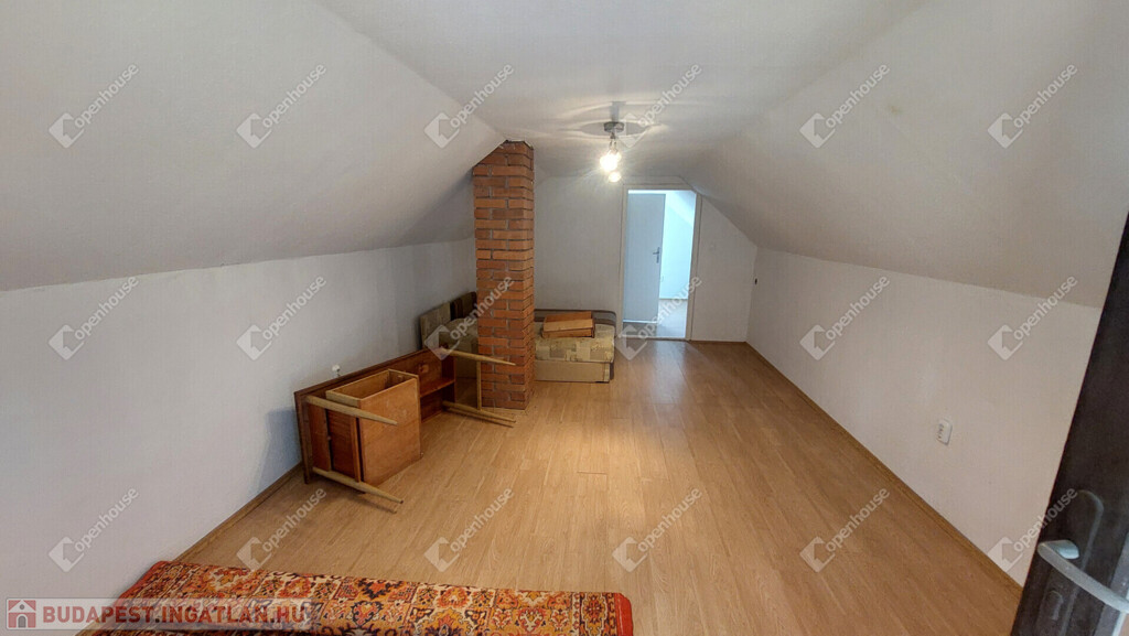 Emelet: egybenyitott, de könnyen két szobára osztható helyiség + nagy erkély.