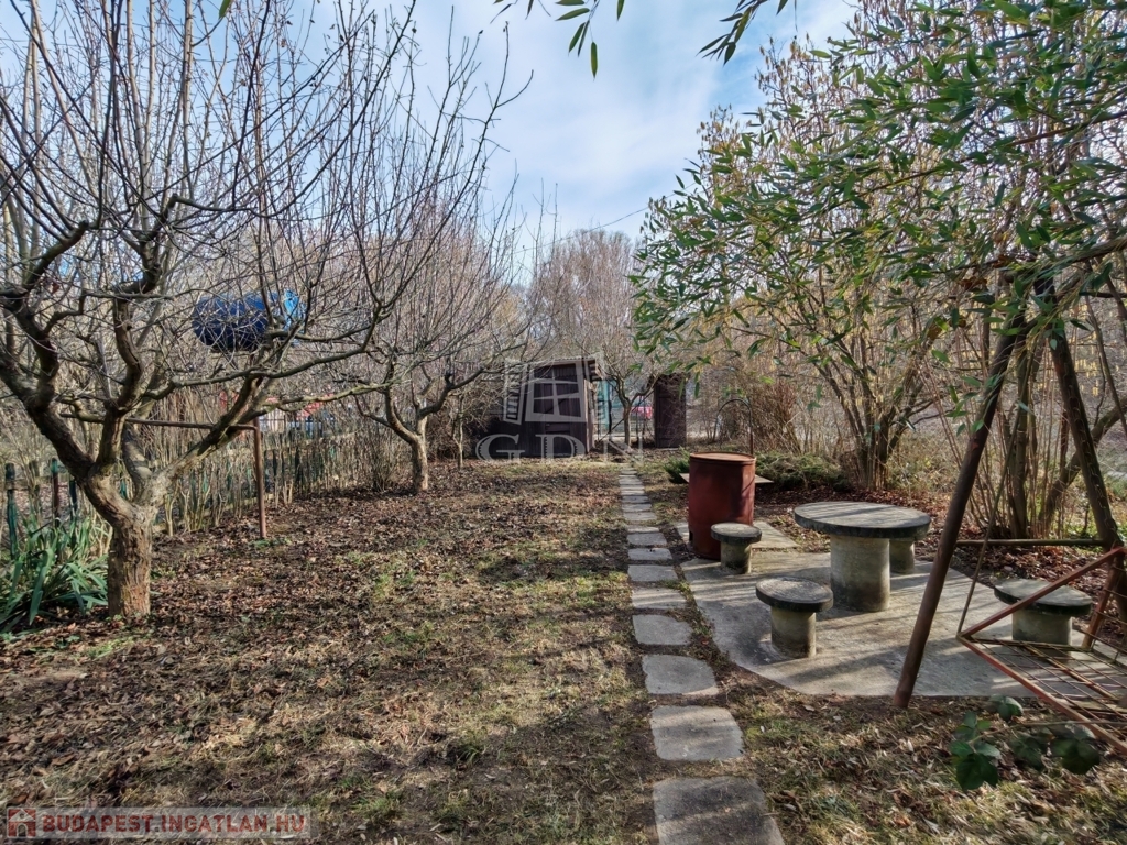 A telek végében, fa szerkezetű szerszámtároló és kültéri WC húzódik.