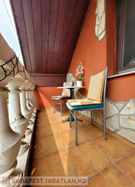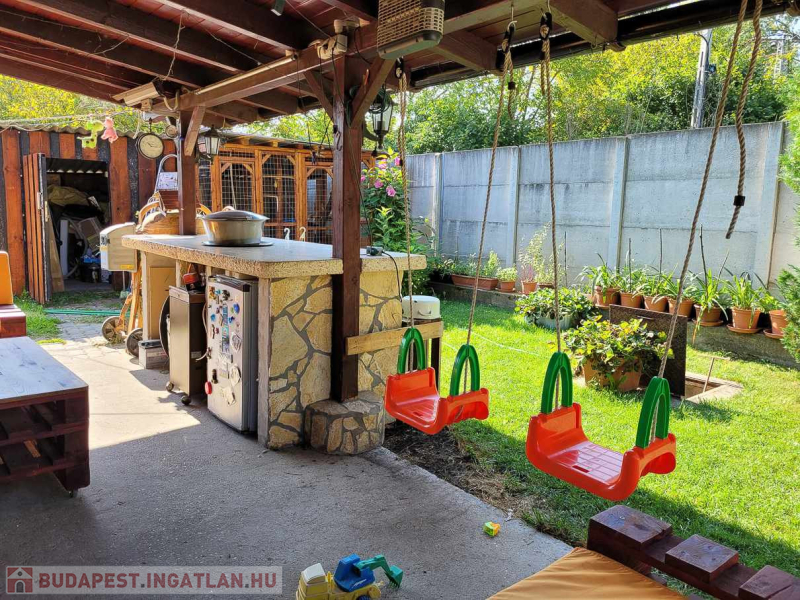 A házhoz tartozik egy kb 30 nm-es terasz, ahol a pult alatt hűtő van és kis tárolók, ahová a sütéshez, tálaláshoz szükséges dolgokat tehetik.