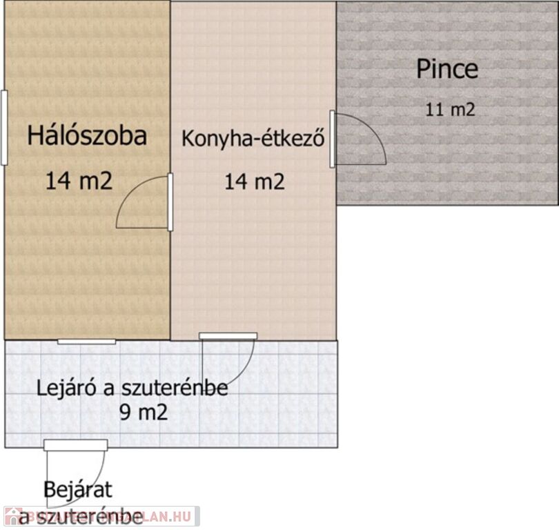 Az alsó szinten, szuterénben 1 hálószoba, 1 étkező-konyha és egy pince található. A beépíthető tetőtér további lehetőségeket rejt magában. A feljáró és a fenti félig fedett terasz már elkészült, ahonnan panorámás kilátás nyílik a Balatonra, illetve lehetőség van egy új lakrész kialakítására is.
