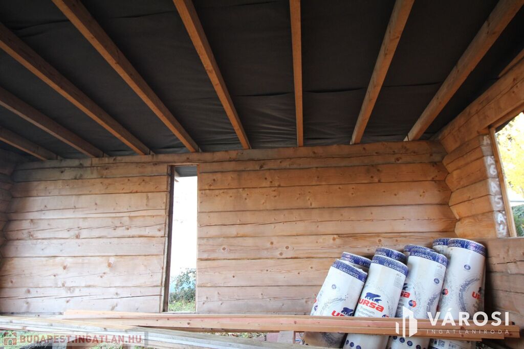 A rönkház szerkezete már készen van, a tetővel együtt. A nyílászárókat, az alsó padozatot, és a mennyezeti szigetelést kell még beépíteni.