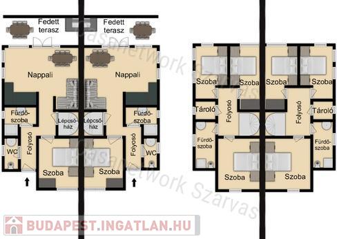 - A jobb oldali rész földszintjén szoba, fürdőszoba, külön illemhelyiség, folyosó, lépcsőház, amerikai konyhás nappali, fedett terasz lett kialakítva. Emeleti részén 3 szoba, tároló, fürdőszoba illemhelyiséggel, lépcsőház található.