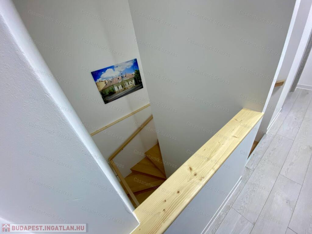 - A szobák, a tároló, a folyosók, a lépcsőház laminált padló, az amerikai konyhás nappali vinyl padló, a fürdőszobák, az illemhelyiség, a fedett terasz járólap, kő burkolatú.