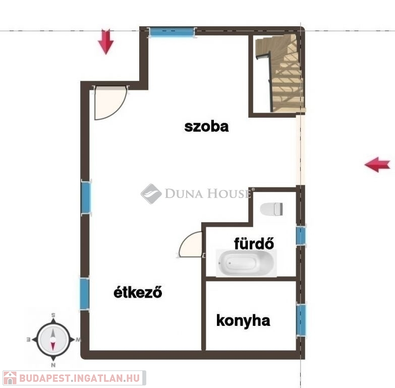 A földszinten található, szoba, előszoba, étkező, konyha, fürdő.