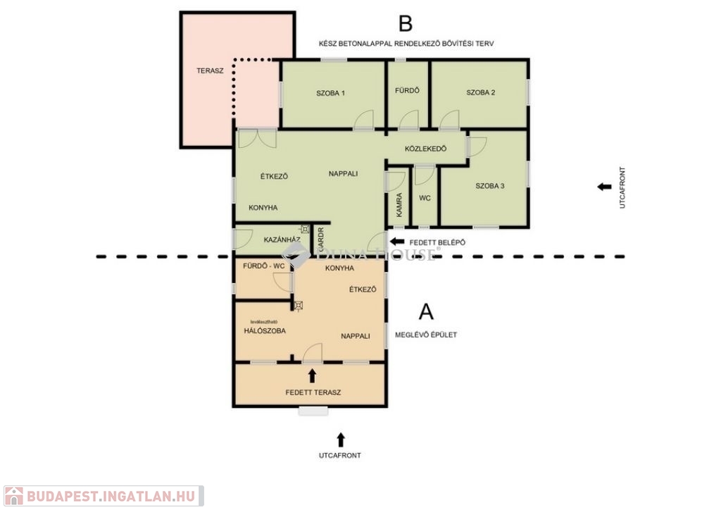 Bővítés: a meglévő épület továbbépítésével 130–140 m²-es családi ház alakítható ki.
