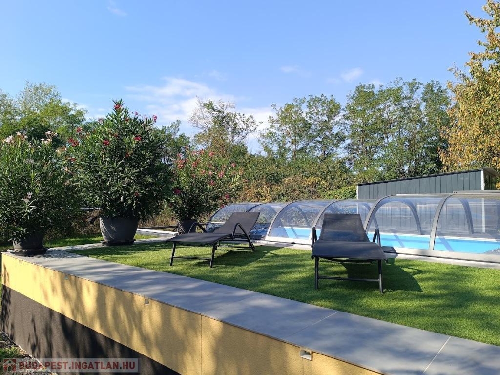 Már az udvaron megérzed a harmóniát: a 5×3 méteres, fedett medence, a műfüves napozórész és a tágas, fedett terasz gázos grillel hívogat, hogy eltölts egy nyugodt délutánt a családdal vagy barátokkal. A hátsó kertből az erdő látványa köszönt vissza – igazi feltöltődés minden nap.