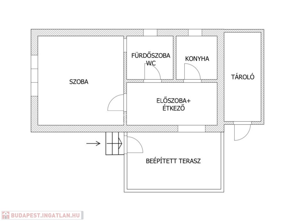 A ház helyiségei egy szoba, konyha, fürdőszoba, előszoba és beépített terasz.