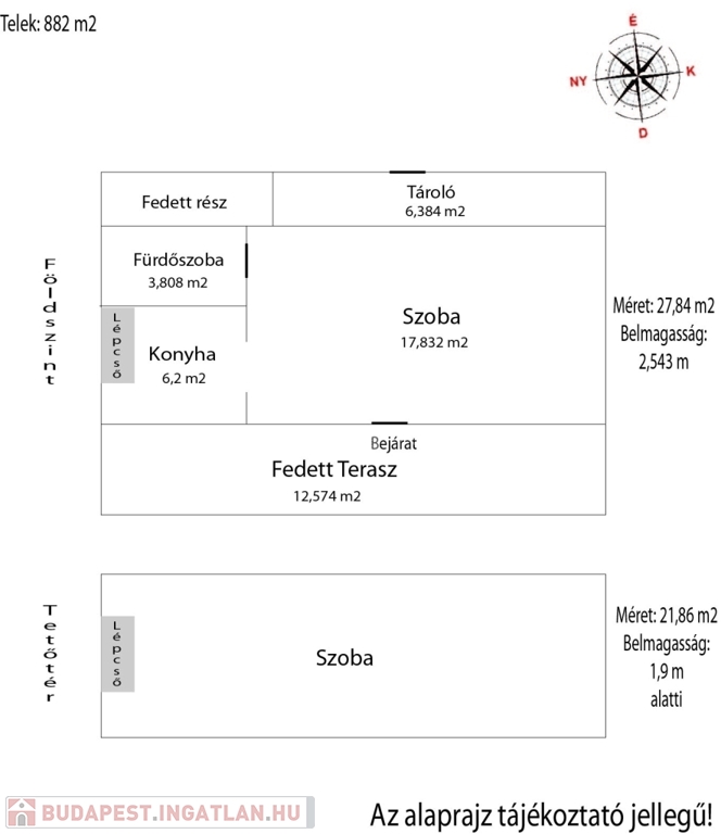 A tetőtér mérete 22 m2, de az 1,9 m belmagasság alatti.