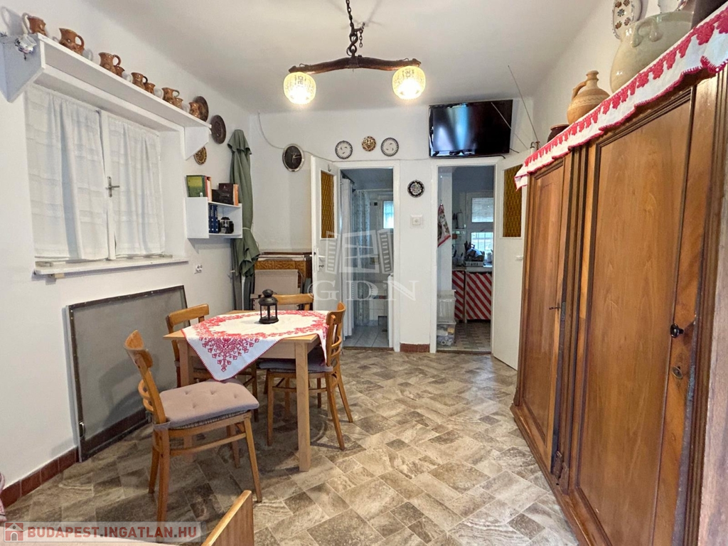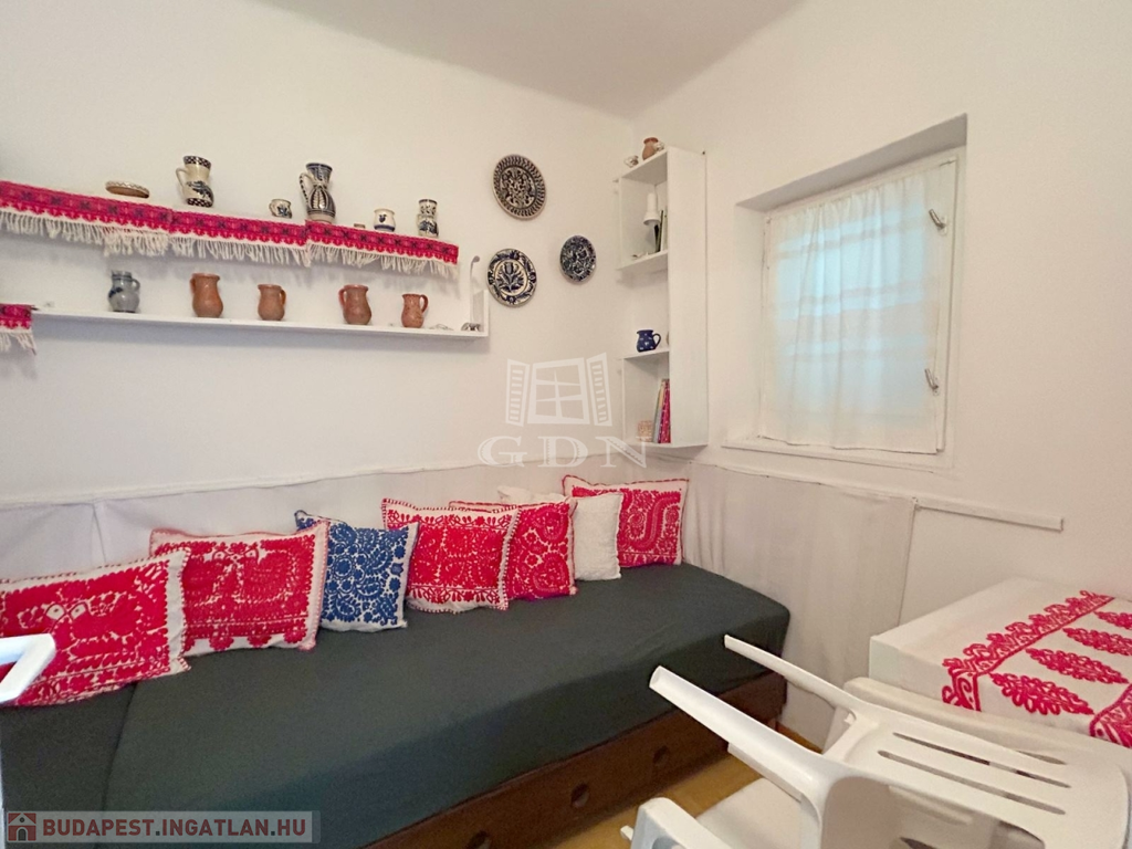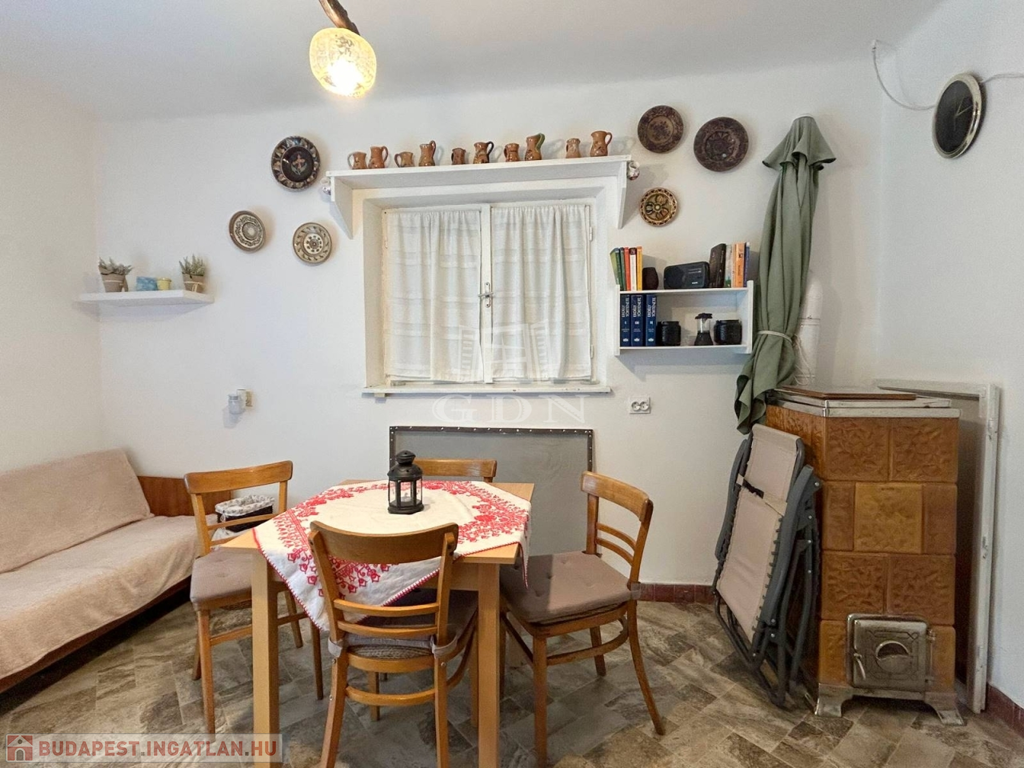 4846. Velencefürdőn a számozott utcák felső szakaszában fekvő, 541 m2-es, 20%-ban beépíthető telken, 60-as években épült, karbantartott, jó állapotú, nappali + 2 félszobás + a tetőtérben kialakított 1 hálószobás, 33 m2 nettó alapterületű, tégla építésű, zsindely fedésű, hordozható cserépkályhával fűthető hétvégi ház, 9 m2-es terasszal, tároló helyiséggel eladó. A gondozott, szép kertben termő gyümölcsfák, örökzöld növényezet, betonozott kerti pince és faház tároló találhatók. Parkolás telken belül is lehetséges. Bővítéssel a nyaraló lakóházzá is átépíthető. Irányár: 38,5 Mft