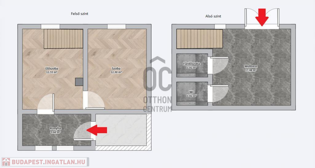 - Felső szint: előszoba, szoba, és egy konyha.