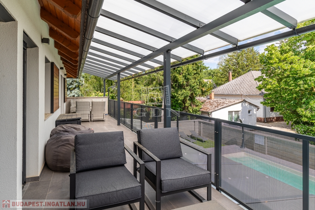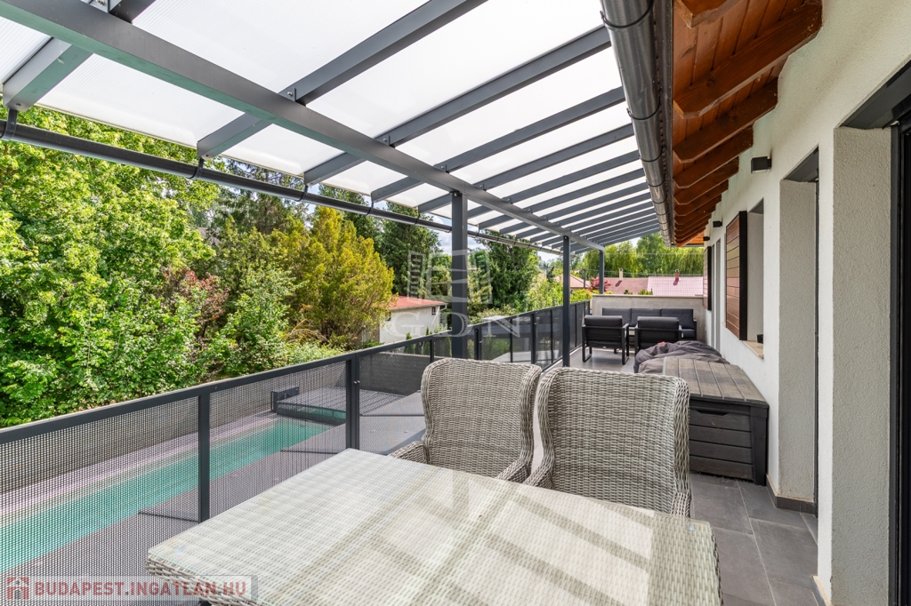 A telken kialakításra került egy 8x4 méteres távvezérléssel is fűthető, fedett, esti megvilágítással rendelkező medence, melyet térkövezett napozóterasz vesz körbe.