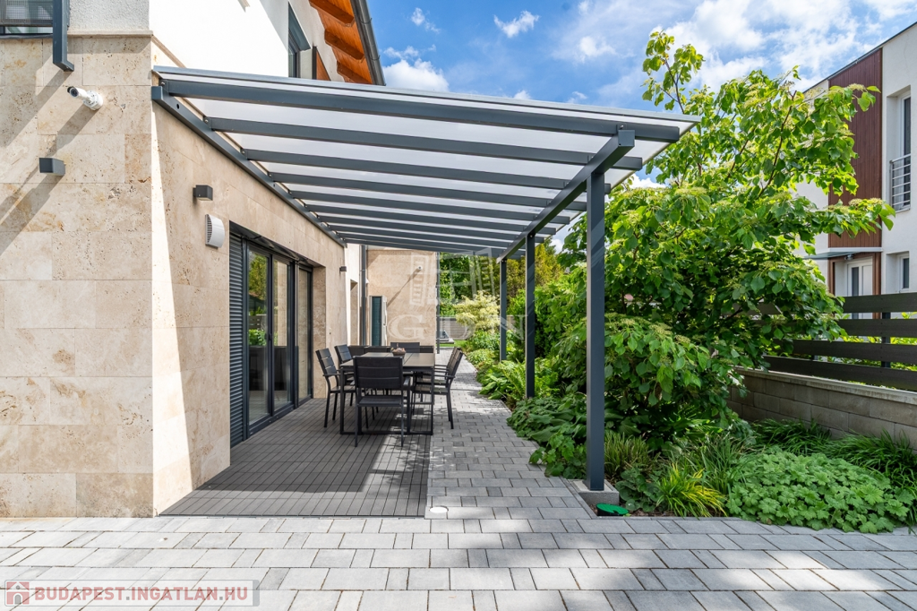 Az ingatlan kertész által gondozott kerttel, programozható öntözőrendszerrel, kamera-, beléptető- és riasztórendszerrel, valamint elektromos autó töltővel felszerelt.