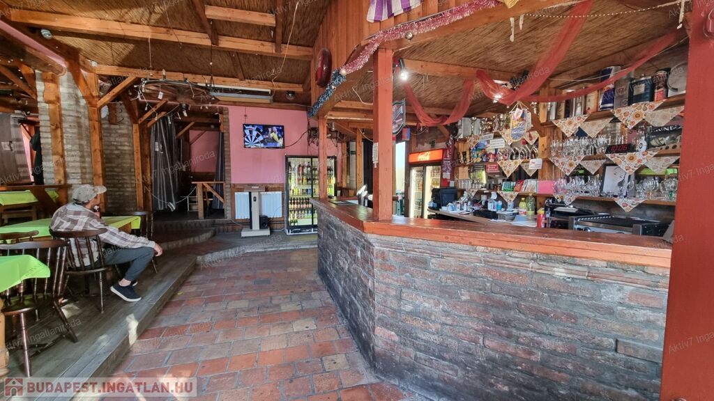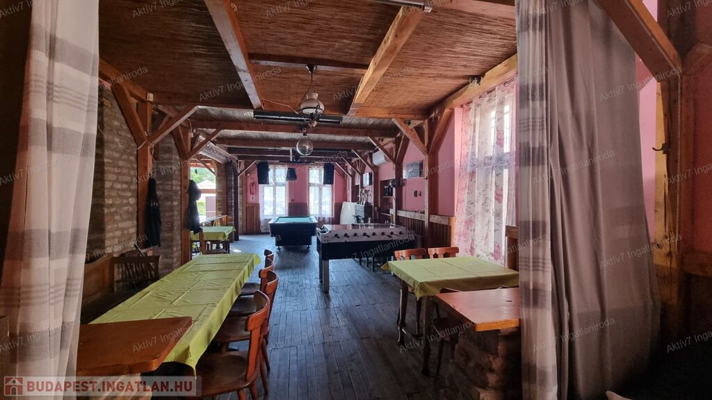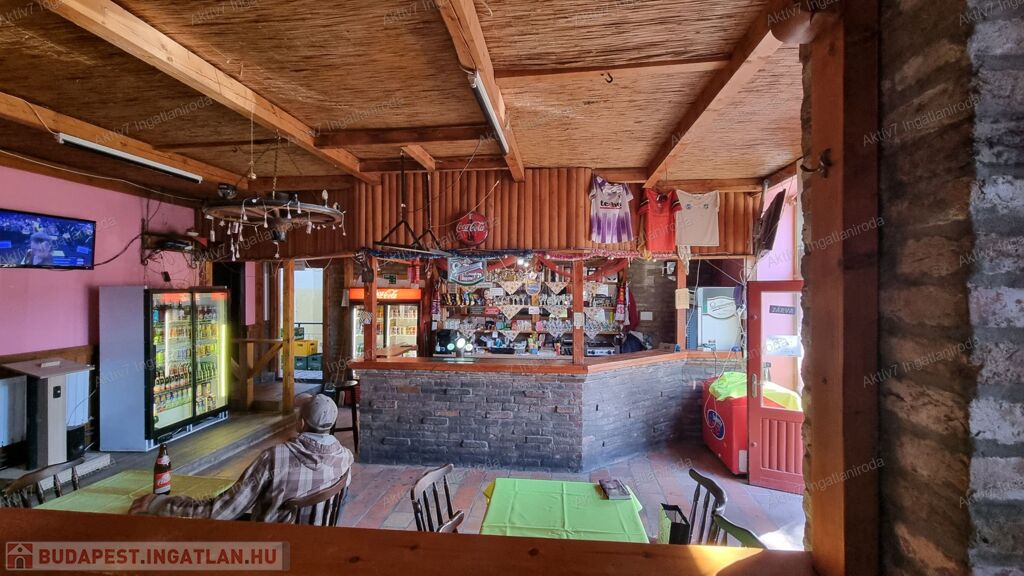 Az épület kb. 250 m2 területű, téglaépítésű. Az elrendezés tekintetében: kiszolgáló pult, vendégtér, konyha, raktárak és szociális helyiségek vannak kialakítva, valamint két udvari garázs ami raktárként funkcionál. Jelenleg konyhát nem üzemeltetnek, de van főzési és pizza sütési lehetőség is.