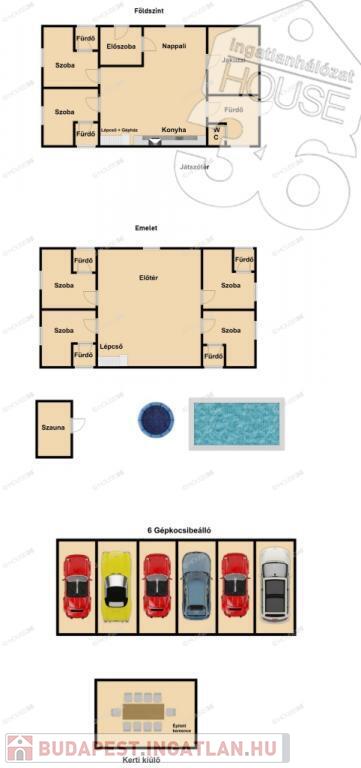 - 6 fürdőszoba (2 kádas, 4 zuhanyzós) + 1 mosdó külön wc-vel