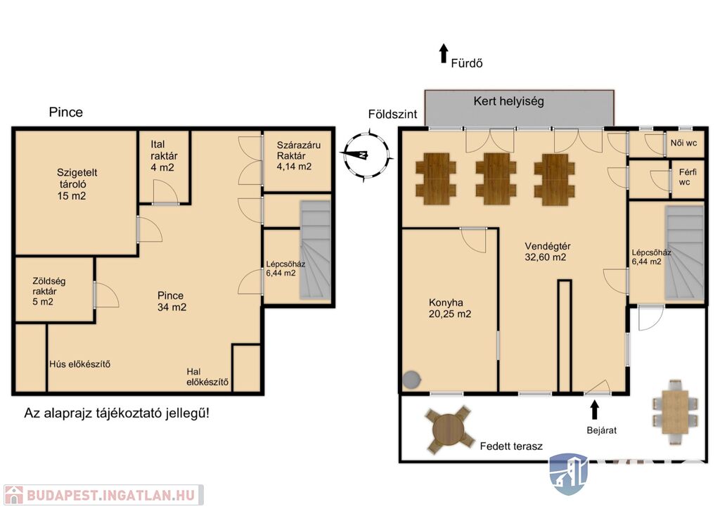 Földszint: konyha, vendégtér, bárpult, női, férfi illemhelyiség