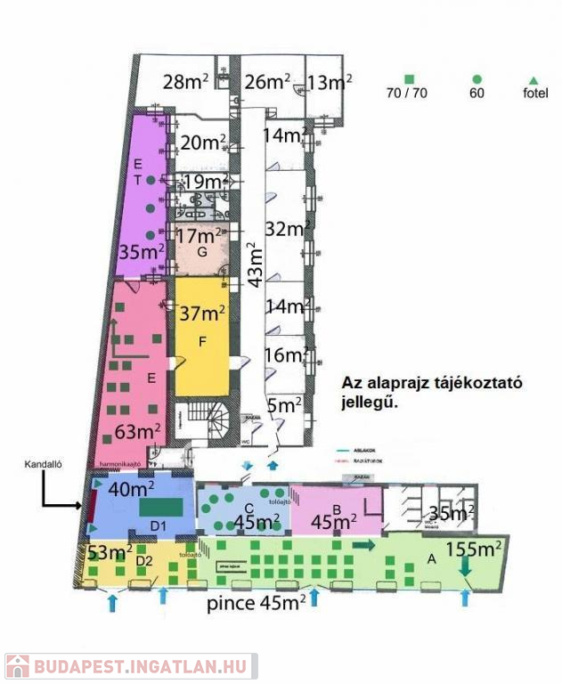 több összejövetelre alkalmas helyiséggel rendelkezik, irodákkal,