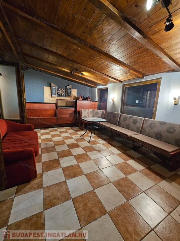 -az alsó szinten felszerelt konyha, tágas kiszolgáló egység található, míg a tetőtérben vannak a vendég mosdók. Szintén a tetőtérben kialakításra került 3 félszoba, fürdőszoba WC-vel, mely ideális az alkalmazottak elszállásolására.