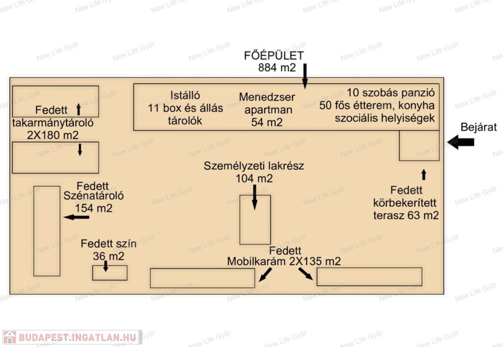 357 m2-es főistálló (11 istálló (3X3m) + 11 férőhely lovaknak, nyeregtárolóknak)