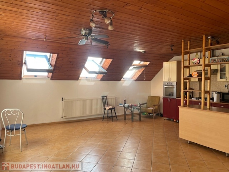 Belső feljáró visz a legfelső szintre, ami lakásként funkcionál. Tágas fürdőszoba, hatalmas amerikai konyhás étkező, egy nagy szoba, mögötte egy tárolóhelyiség, amiből akár tökéletes gardrób válhat.