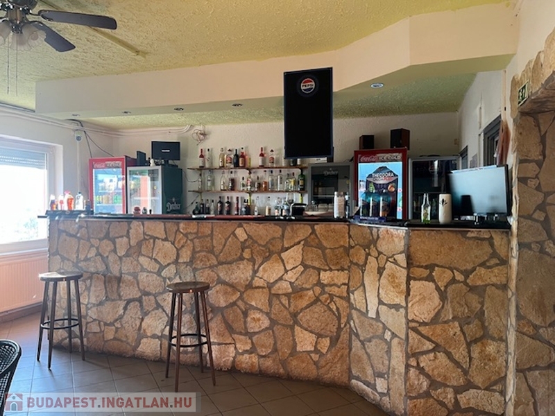 Itt egy nagy terem, a söröző pulttal és asztalokkal kisebb helyiségben, konyha, közlekedő, le- és feljáró, 2 vizesblokk (női- férfi WC), valamint a főbejárat van, előtte 6 asztalos terasszal.