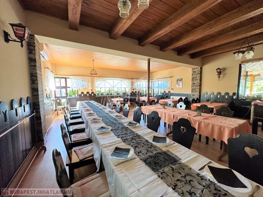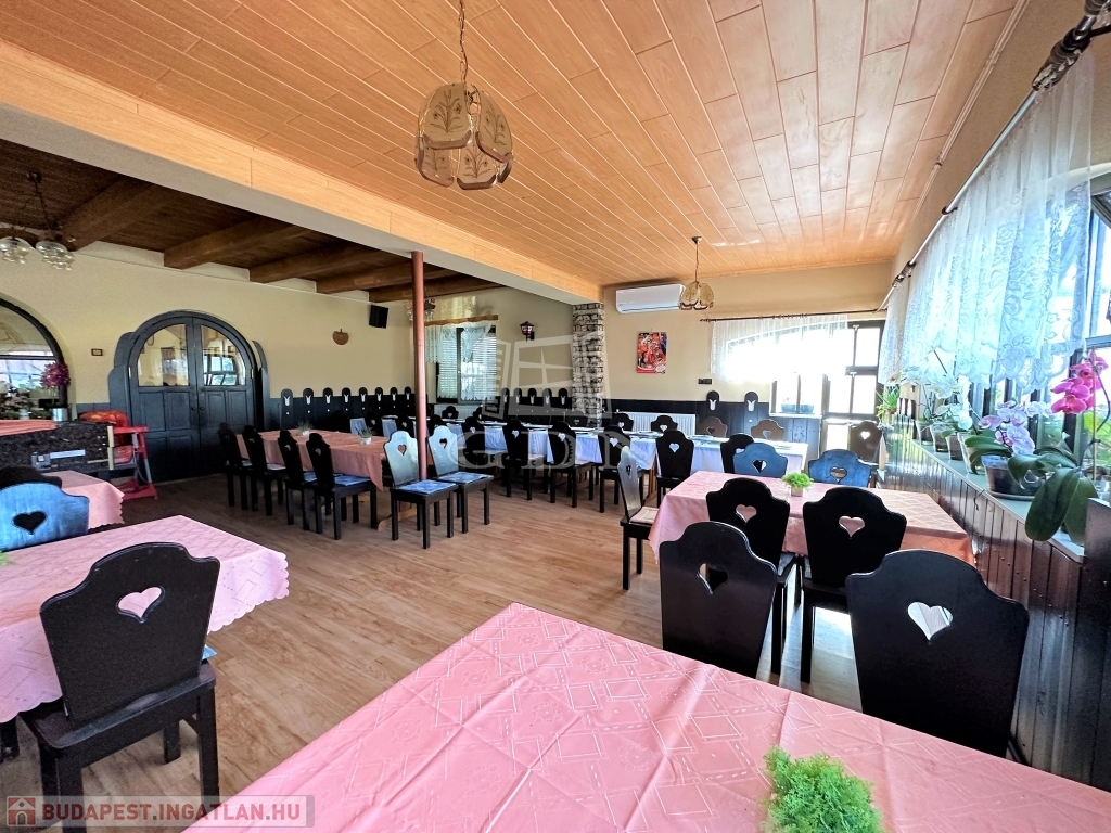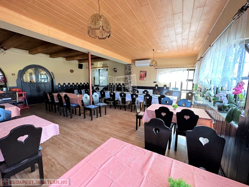 A 260 m2 alapterületű alsó szinten üzemel egy étterem, mely 80-90 fő befogadására alkalmas, két vendégtérre tagolódik.