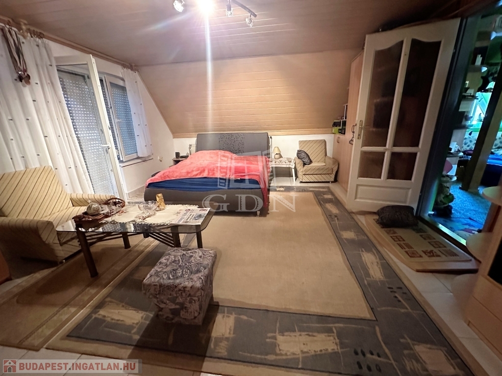 A ház emeletén egy méretes lakás került kialakításra. A tágas, világos nappalin túl egy konyha-étkező, további 3 szoba, fürdőszoba és egy gardrób helyiség is kialakításra került.