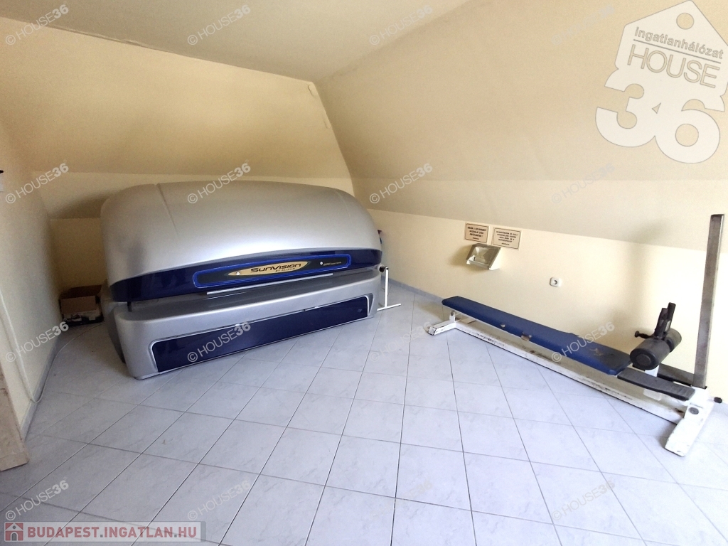 ennek emeletén ( kb. 40 m2) álló és fekvő szoláriumok, valamint hozzátartozó öltözők, mellék helyiségek, továbbá