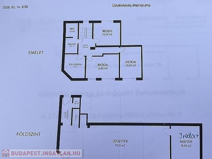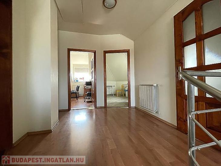 Az 56 m²-es emeleten két különálló irodahelyiség, egy teakonyha, egy mosdó, valamint egy kisebb raktár található, így az emelet ideális adminisztratív vagy irodai funkciók ellátására.