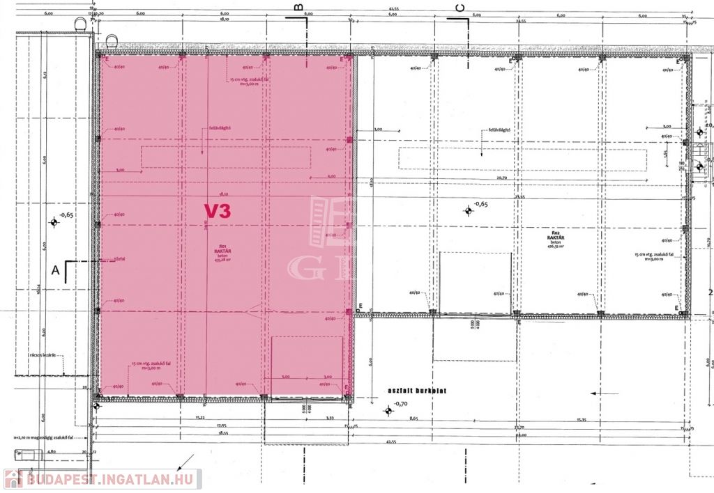 A raktár 25,6 x 34,5 méter alapterületű, belmagassága 4,5 - 8 méter