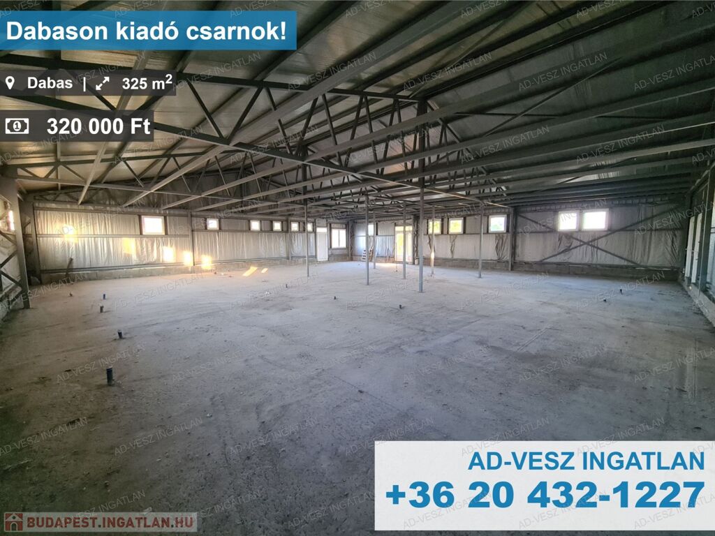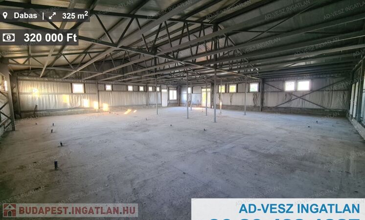KIADÓ 325M2 raktár / csarnok kiadó Dabas jól megközelíthető, központ közeli helyén, ipari árammal, azonnal költözhetően!
