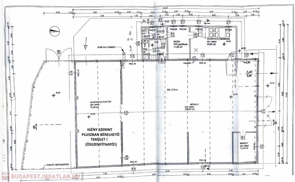 FIGYELEM: igény szerint az alaprajzon látható ALAPANYAG RAKTÁR ( 76,49 m² ) pluszban bérelhető a területhez, ebben az esetben az össz. alapterület: 361,49 m² lenne. Ez a terület jelenleg leválasztásra került, de kérésre egybenyitható / hasznosítható !