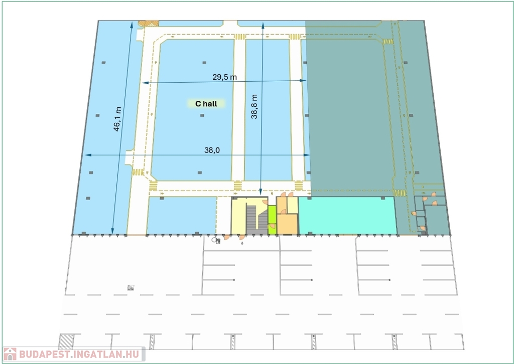 A csarnok területe 1 685,4 m2, melyből 276,7 m2 berendezett magaspolcos raktár, 181,1 m2 fejépületi csarnokrész, 23,8 m2 szociális helyiség.