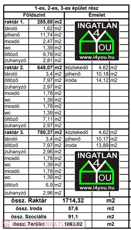 - Raktár csarnok: 1715 m2