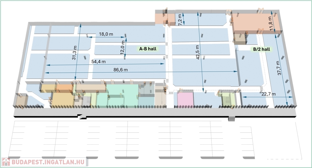 Területmegosztás: A csarnok területe 3 365,05 m2, melyből 2 911m2 gyártó csarnok, 356,7 m2 irodák, 96,8 m2 kiszolgáló és szociális helyiségek. Bővíthető + 1 125m2-el, illetve +1 685m2-el, így akár 6 175m2 tud rendelkezésre állni.
