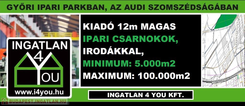 Győrben, az Audi gyár mellett 5.000 m2-től, rugalmas méretben, 100.000 m2-ig, 12m magas, ipari csarnokok, irodákkal kiadók.