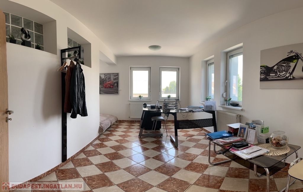 Az emeleti iroda rész kialakítása, lehetővé teszi hogy akár egy kényelmes modern lakásként legyen használva, amennyiben a Bérlő ezt igényli.