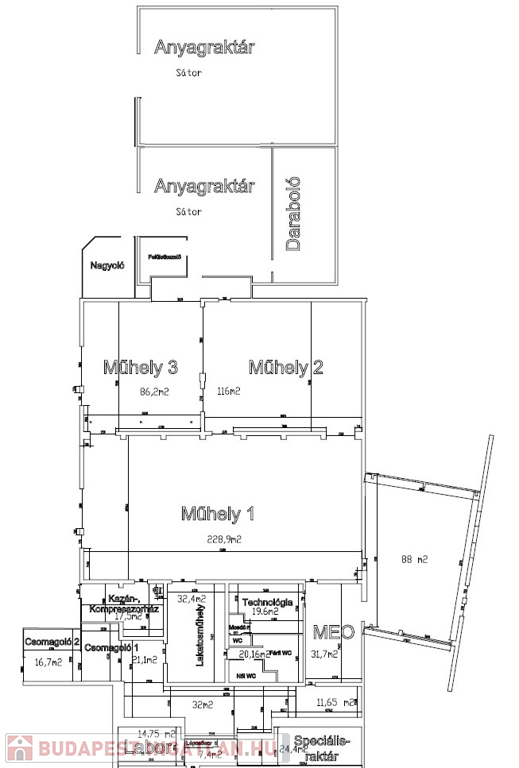 Az ~755 m2-es üzemcsarnokból, cirk 20 m-en találhatók a wc-k, mosdók, a fennmaradó ~735 m2, ~3,4 m belmagasságú rész termelésre, raktározásra alkalmas. További tárolási lehetőséget kínál a két darab 150 m2-es sátor és egy acél szerkezetű 60 m2-es tároló.