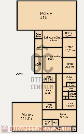 - Kiszolgáló helyiségek: raktár, tároló, iroda, tárgyaló, öltöző, fürdő és WC