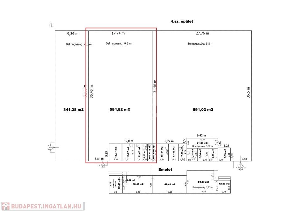 A helyiséghez tartozik 55m2 iroda, szociális rész is.